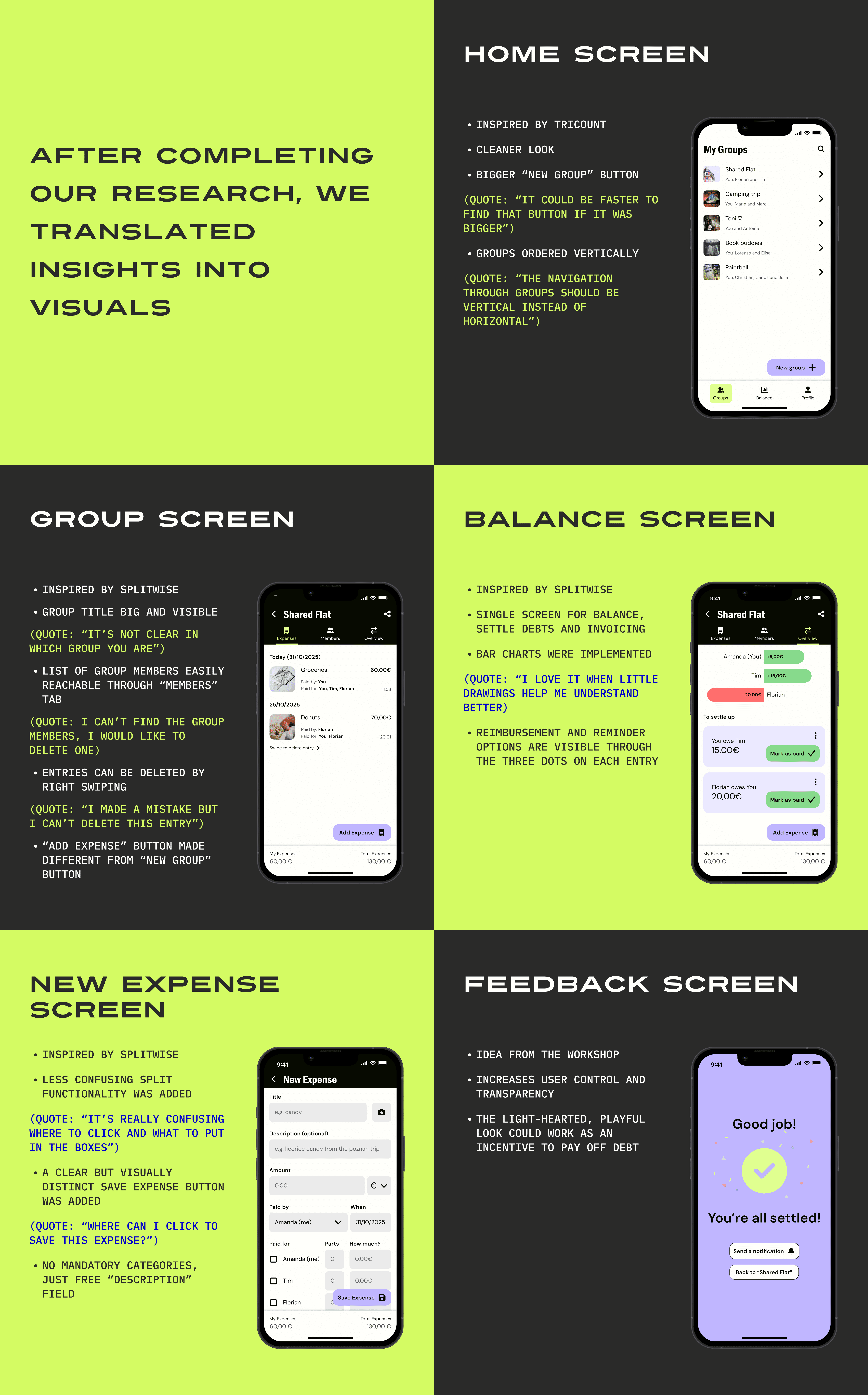 BillSplittr is an expense sharing app, born from an extensive research project at my masters. A year after finishing this project, I decided to look again at the data I found with my team to design prototype screens for it using Figma. Our goal was to compare three different apps on the market with qualitative and quantitative methods, gathering feedback on desirable features and pain points to design the ultimate expense sharing app. This was a great exercise for my research skills, allowing me to get familiar with different techniques.